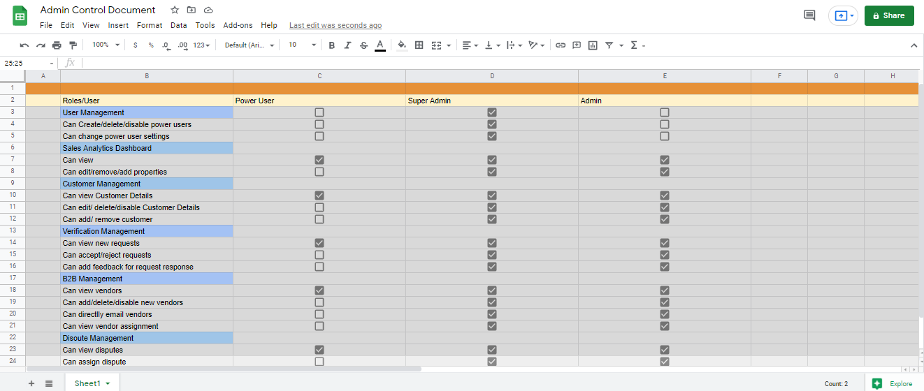 Role-based Access Management systems are pivotal for client admin panel access. I've undertaken the task of defining an access control document, delineating various functions offered by the admin panel and specifying which functions are accessible to different roles. Please find a sample above for reference.