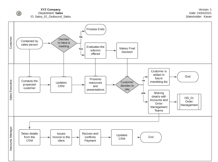 Process mapping is a profound tool, especially for clients seeking assistance in explaining processes to employees, measuring efficiency gaps, or documenting processes post-automation implementation. I've found various methodologies like flowcharts, BPMN, and IA indispensable for this analysis. Above is an example of a process map I created for a sales process.